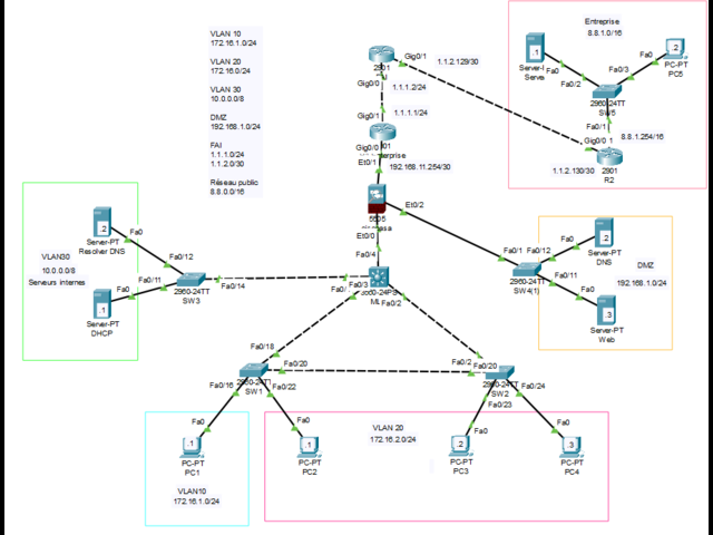 Afin d'assurer la connectivité au sein d'un réseau, nous avons mis en place une topologie comprenant trois VLAN connectés à un MLS (Multilayer Switch), lui-même relié à un ASA (Adaptive Security Appliance) et une DMZ. L'ASA est connecté à un FAI (Fournisseur d'Accès Internet) et à un réseau d'entreprise. L'objectif était de respecter le cahier des charges tout en garantissant la sécurité imposée par l'ASA.