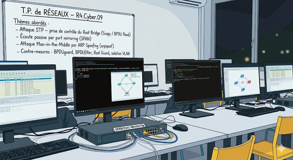 - Outils & notions GNS3, Kali Linux, Scapy, Wireshark, ARP Spoofing, STP, SPAN, VLAN, Pentesting